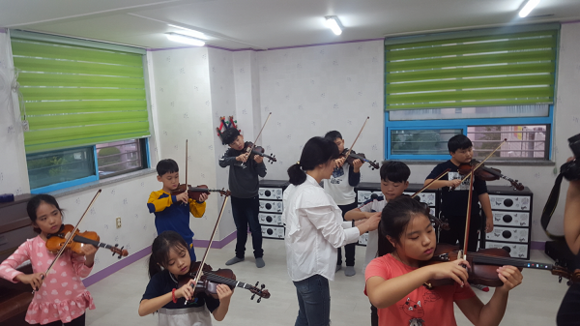 ▲예평국제학교 재학생 탈북 아이들이 바이올린 수업을 듣고 있다. (사진=동아대)