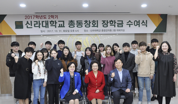 신라대 총동창회는 31일 오후 교내 60주년기념관 2층 대회의실에서 류경화 총동창회장 등 학내외 인사들이 참석한 가운데 2017학년도 2학기 총동창회 장학금 수여식을 개최했다. 이날 신라대 총동창회는 20명의 재학생들에게 1인당 100만원씩 총 2천만원의 장학금을 전달했다. (사진=신라대)