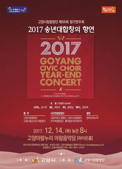 오는 12월 14일 저녁 8시 고양아람누리 아람음악당에서 고양시립합창단의 송년음악회인 '제56회 정기연주회-2017 송년대합창의 향연'을 전석 초대(무료)로 공연할 예정이다. 따라서 고양시민들의 송년 한마당이 될 전망이다.