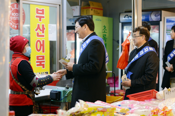 ▲기보 김규옥 이사장(가운데)이 부산본점 인근 전통시장에서 상인과 영세중소기업인을 만나 '일자리 안정자금'을 설명하고 있다. (사진제공=기보)