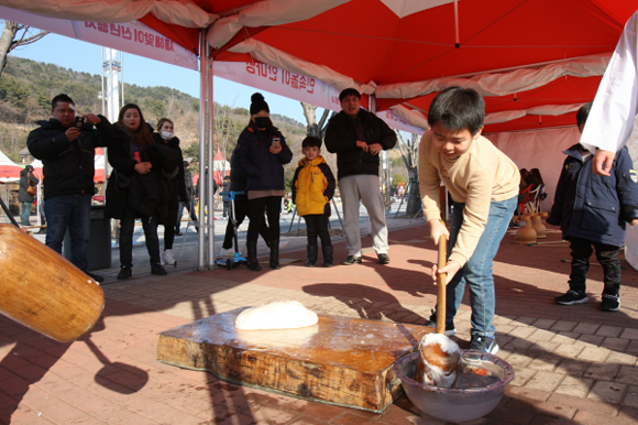 ▲최근 열린 렛츠런파크 부경 신년행사에서 어린아이가 떡메치기를 하며 즐기고 있다. (사진제공=렛츠런파크 부경)