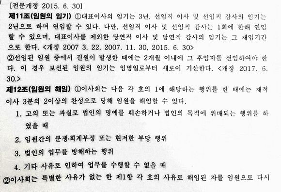 ▲고양문화재단 정관 11조 임원의 임기(사진= 김진부 기자)