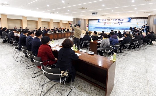 ▲김포시는 이번 평창동계올림픽의 남북간 평화무드를 기회로 삼아 남북 평화교류협력의 중심도시로 선점하겠다는 의지를 표명햇따. 사진은 신년 브리핑 기자간담회 장면(사진= 김포시)