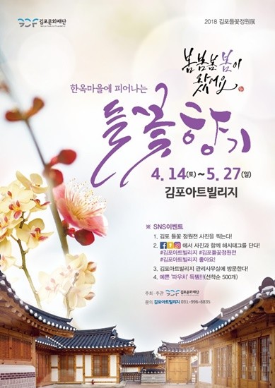 김포문화재단(대표 최해왕)은 오는 14일부터 5월 27일까지 김포아트빌리지 한옥마을 일대에서 야생화 작가들이 참여하는 '2018년 김포 들꽃 정원展 - 한옥에 피어나는 들꽃 향기'를 개최한다고 밝혔다. 현재 빛거리전도 지속적으로 운영되고 있다.