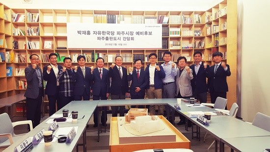 ▲자유한국당 박재홍 파주시장 후보가 파주출판도시에서 간담회 후 기념촬영하고 있다(사진= 박재홍 캠프)