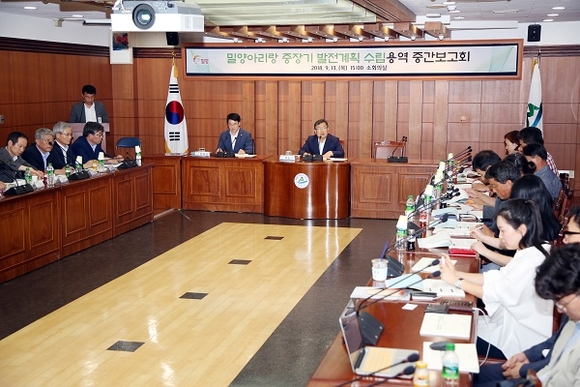 경남 밀양시는 13일 시청 2층 소회의실에서 밀양아리랑 중장기 발전계획 수립 용역 중간보고회를 가졌다.