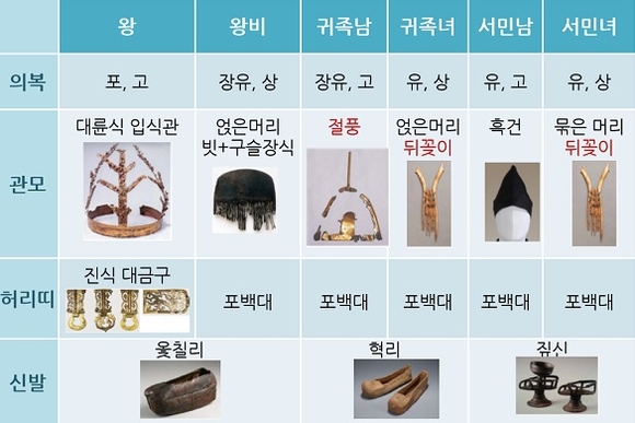 장신구의 경우 관모, 머리장식, 허리띠, 신발 130여점을 조사 후 아이템별, 신분별, 남녀별로 구분했다.