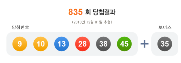 1일 추첨한 제835회 ’로또6/45’의 1등 당첨번호가 9, 10, 13, 28, 38, 45’로 결정됐다. 당첨번호 6개를 모두 맞힌 1등 당첨자는 15명으로 각각 12억 3368만 원을 수령하게 된다.