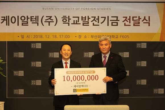 부산외국어대학교는 지난 18일 대학 본부에서 ㈜케이알텍이 대학발전기금 1000만 원을 기탁했다고 21일 밝혔다.