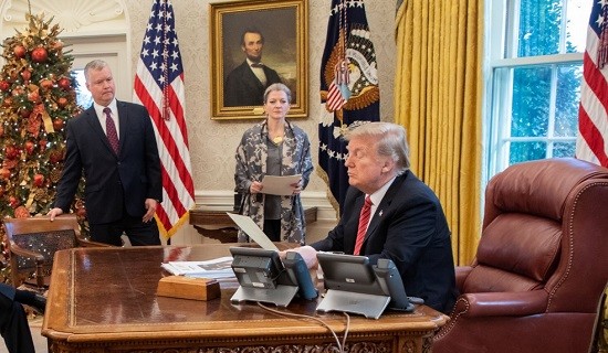 이와 함께 트럼프 대통령은 한 장의 사진을 공개했다. 트럼프 대통령은 미국 대통령 전용책상인 ‘결단의 책상’에 앉아서 서류를 읽고 있다. 그 옆에는 스티브 비건 국무부 대북정책 특별대표와 앨리슨 후커 백악관 국가안보회의 한반도 보좌관이 서 있다. 거대하고 화려한 백악관 크리스마스 트리도 보인다.