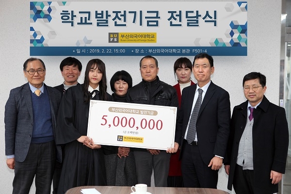 부산외국어대학교는 글로컬창의융합대학 사회체육학부 졸업생 김유정(사진 앞줄 왼쪽 2번째) 씨가 대학발전기금 500만 원을 기탁했다고 22일 밝혔다.