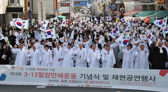 지난 13일 밀양시 관아 앞에서 2000여 명의 시민과 학생, 국가유공자 유족 등이 참여한 가운데 영남지역 최초의 대규모 항일운동인 3.13 밀양만세운동이 재현됐다.