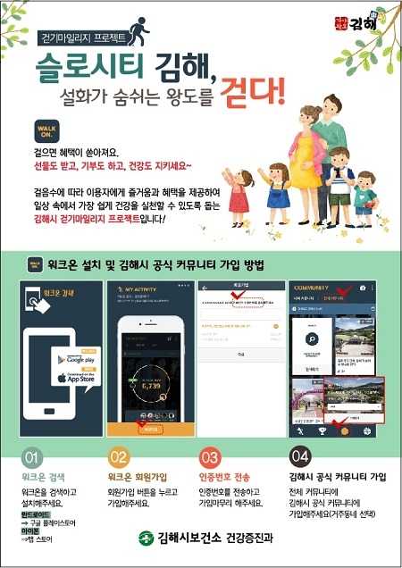 경남 김해시는 지난달 25일 도내 최초로 모바일 걷기 앱인 '워크온'을 도입하고, 김해시 공식커뮤니티를 개설했다고 3일 밝혔다.