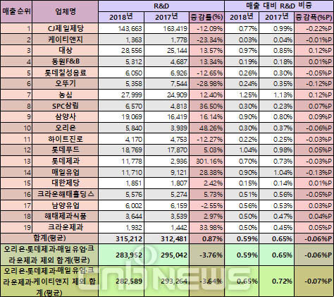 미래를 위한 투자라고 할 수 있는 연구개발비(R&D)는 19개사 평균 0.87% 증가했으며, 오리온 등 4개사를 제외하면 3.8% 줄었다. 케이티앤지를 제외하면 2.6% 감소했다.