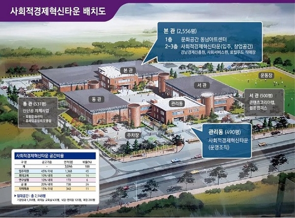경남도는 당면한 고용위기 극복과 창원국가산업단지 활성화를 위해 창원시와 공동으로 동남전시장을 매입해 본관과 관리동에 경남 사회적경제혁신타운을 조성한다.
