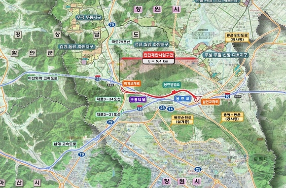 지개~남산간 연결도로 민간투자사업은 의창구 북면 지개리(국도79호선)에서 동읍 남산리(남산ic)를 연결하는 총길이 5.4㎞(터널 0.55㎞, 교량 ㎞), 폭 20m의 창원시 주요 외곽도로로 추진된다. 시는 2천억원의 사업비를 투입해 오는 2021년 7월 완료할 계획이다.