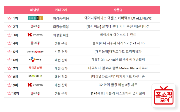 홈쇼핑모아가 4월 셋째·넷째 주 홈쇼핑사 14곳(TV홈쇼핑 7곳, T커머스 7곳)의 판매량을 집계한 결과에 따르면, 화장품·미용이 지난 순위(홈쇼핑 열전6)에 이어 또 1,2,3위를 휩쓸었다.