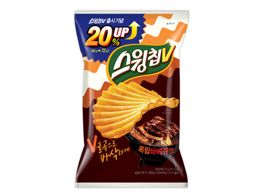 오리온은 스윙칩V 폭립바베큐맛 출시 기념으로 스윙칩 전 제품을 가격 변동 없이 20% 증량해 6월 둘째 주까지 한정 생산할 계획이다.
