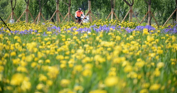 22일 경남 거창군 남상면 거창창포원을 찾은 주민이 노랗게 핀 창포 꽃길을 따라 자전거를 타고 있다.