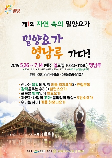 '제1회 자연 속의 밀양요가'는 '밀양요가 영남루 가다!'라는 슬로건으로 오는 26일 시작해 7월 14일까지 매주 일요일 오전 10시 30분부터 1시간 동안 8차에 걸쳐 진행된다. 커플·하모니·워킹·댄스요가 등으로 구성해 남녀노소 누구나 서서 할 수 있어, 밀양요가는 쉽고 재미나는 운동이라는 것을 체감할 수 있도록 했다.