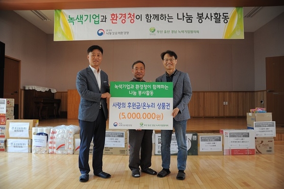 낙동강유역환경청과 부산·울산·경남 녹색기업협의회 회원 40여명은 24일 울산시 울주군 언양읍 소재 중증장애인거주시설 혜진원을 찾아 700만원 상당의 후원금과 생필품을 지원하고, 시설 내·외부 청소, 마술쇼 관람 등 사랑나눔 봉사활동을 가졌다. (사진=낙동강청 제공)