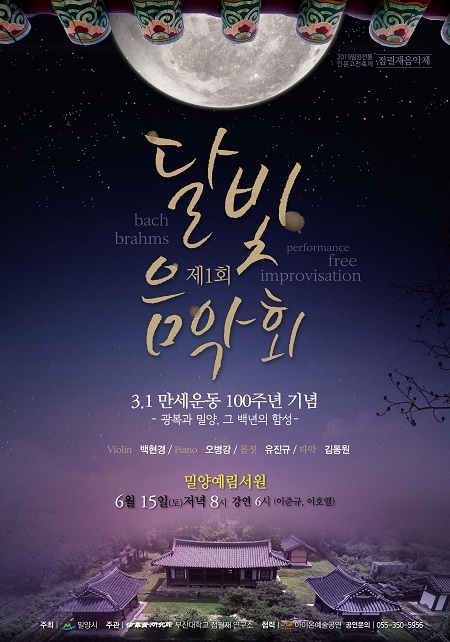 ▲달빛음악회는 예림서원의 은은한 달빛 아래에서 펼쳐진다. 자유로운 감성으로 깊은 내면의 소리를 듣는 즉흥연주가 바이올리니스트 백현경, 건반 위 섬세하고 강한 터치로 사랑을 노래하는 피아니스트 오병강, 보이지 않는 것들과 몸짓으로 이야기하는 마임배우 유진규, 요요마 실크로드 앙상블 단원으로 국악즉흥 타악의 고수인 김동원이 출연해 브람스의 '스케르조(Scherzo)', 바흐의 '지선상의 아리아(Air on the G String)', 림스키 코르사코프의 '왕벌의 비행(Flight of the Bumblebee)' 및 몸짓 타악 바이올린의 퍼포먼스와 자유로운 즉흥 연주로 3・1운동의 뜨거운 심장소리를 예술의 혼으로 되살릴 것이다.