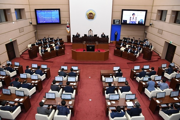 이날 본회의는 ▲황재은 의원(비례대표)의 '소상공인 지원과 경남경제 활력을 위한 경남형 지역화폐 도입 촉구' ▲이영실 의원(비례대표) '건강가정지원사업 종사자의 처우개선과 지원방안 마련을 위하여' ▲심상동 의원(창원12) '부산항 제2신항과 경남의 발전을 위한 제언' ▲윤성미 의원(비례대표) '도의회의 민주적 의사수렴과 절차' ▲정동영 의원(통영1) '통영시 시내권 단설 유치원 조속 설립 촉구하며' ▲김윤철 의원(합천) '도시가스 가산 투자보수율 3% 적용으로 도시가스 보급 확대에 나서야' 등 6명의 도의원의 5분 자유발언에 이어 도의회 예산결산특별위원회 구성 결의안 등 3건의 안건을 처리했다.