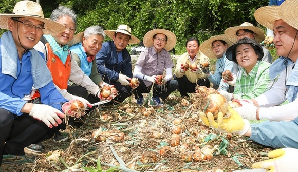 이날 농촌일손 돕기는 다른 농작업에 비해 수작업 인력이 많이 필요한 친환경 양파 수확(2627㎡)을 도와 일손부족으로 어려움을 겪고 있는 농가를 도왔다.