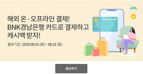 오는 8월 말까지 경남BC카드(개인 신용/체크)를 이용해 해외 온·오프라인 가맹점에서 일정 금액 이상 사용한 후 또는 사용 전에 경남은행 또는 BC카드 홈페이지, BC카드마이태그, 페이북 등에 선택 응모하면 일정액을 캐시백(기간 중 회원당 1회)해 준다.