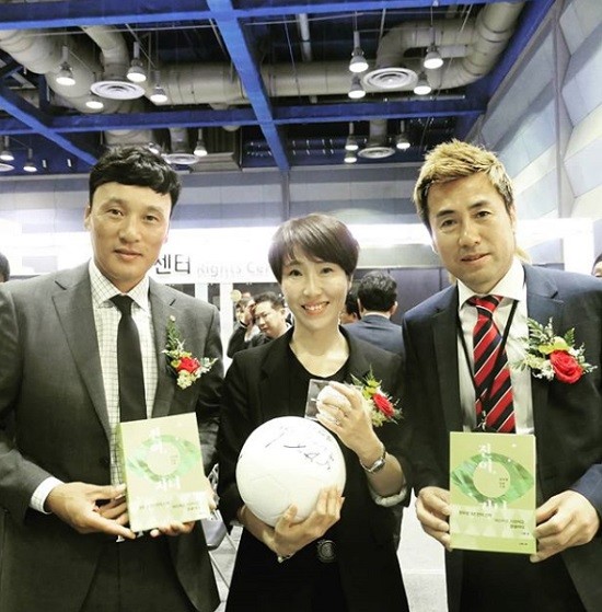정유정 소설가가 서울국제도서전에서 이승엽, 김병지 선수와 기념사진을 찍었다.