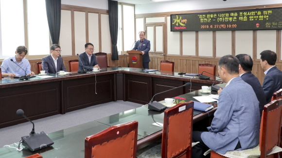 합천군(군수 문준희)과 ㈜참좋은마을(대표 최혜수)은 합천군청 2층 소회의실에서 문준희 군수, 최혜수 대표를 비롯한 관계자 등 10명이 참석한 가운데 ‘합천 참좋은 다문화마을 조성사업을 위한 업무협약’을 체결했다.