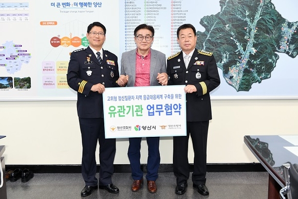 경남 양산시는 정신과적 위기상황 발생 시 신속하고 종합적인 대응을 위해 8일 시, 양산경찰서, 양산소방서 3자간 업무협약을 체결했다.