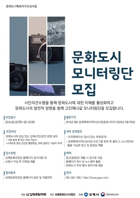 모집인원은 20명으로 김해 문화도시 조성사업에 관심있는 김해시민이면 누구나가 참여 가능하다. 모니터링단으로 선정되면 오는 9월부터 관련 사업 종료시(2020년 4월 예정)까지 활동하게 되며, 문화도시 관련 프로그램에 참여할 수 있는 기회가 우선 제공된다.