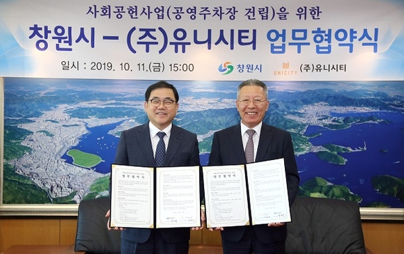 경남 창원시는 지난 11일 시청 시장접견실에서 ㈜유니시티와 사회공헌사업의 일환으로 공영주차장을 건립하기 위한 업무협약을 체결했다고 14일 밝혔다.