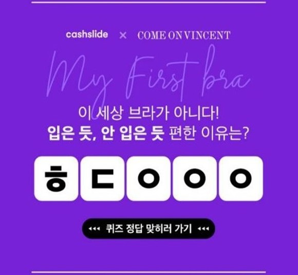캐시슬라이드는 18일 컴온빈센트와의 컬래버레이션 초성퀴즈를 출제했다. ‘이 세상 브라가 아니다! 입은 듯, 안 입은 듯 편한 이유는? ㅎㄷㅇㅇㅇ’이 문제다. 이는 포털사이트 검색창에 ‘컴빈 마이퍼스트브라’ 문구를 치면 알 수 있다. 초성 부분 정답은 ‘히든와이어’다. 이를 맞히면 즉시 100캐시를 적립해준다. 이는 향후 캐시아웃(현금 환급) 가능하다.