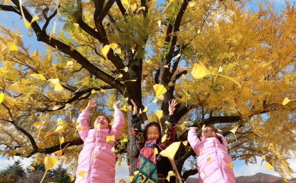11일 오전 경남 함양군 서하면 운곡리 은행마을을 찾은 한 가족이 은행나무(천연기념물 제406호) 아래서 가을 정취를 만끽하며 즐거운 시간을 보내고 있다.