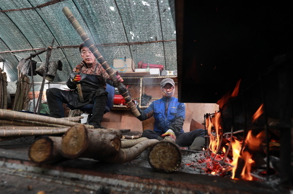 지리산 자락인 경남 함양군 마천면 금계마을에서 안재호씨가 옻나무에 칼집을 내어 불에 그을려 전통방식으로 진액을 채취하고 있다.