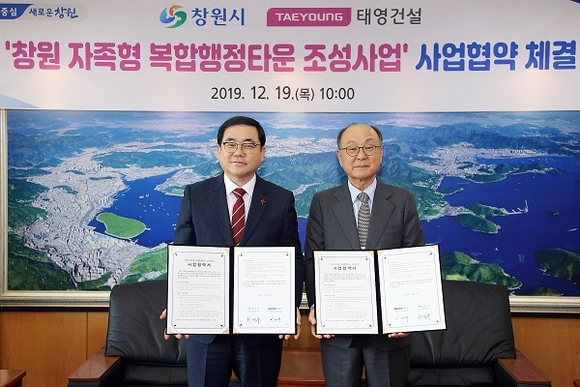 경남 창원시는 19일 마산회원구 회성동 일원 '창원 자족형 복합행정타운 조성사업' 추진을 위해 ㈜태영건설 컨소시엄과 상호간 사업협약식을 가졌다.