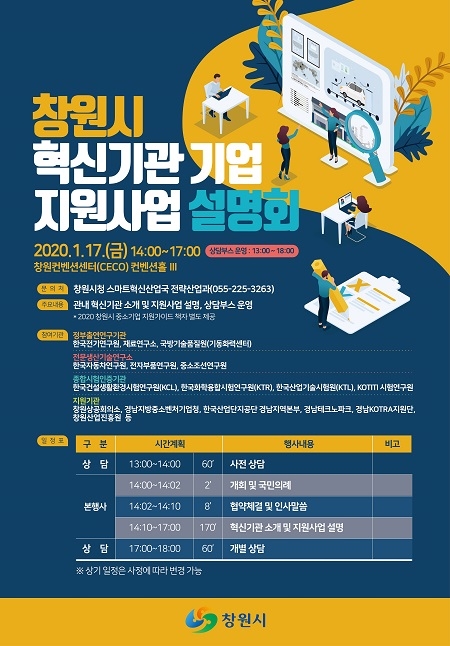 경남 창원시는 오는 17일 오후 2시 창원컨벤션센터에서 '창원시 혁신기관 기업 지원사업 설명회'를 개최한다고 밝혔다.