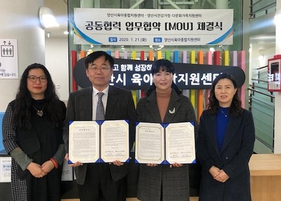 양산시 육아종합지원센터는 지난 21일 양산시건강가정·다문화가족지원센터와 관내 영유아를 자녀로 둔 부모 및 보육교직원의 '건강한 가족' 관계 증진을 위한 상담 사업에 관한 업무협약(MOU)을 체결했다.