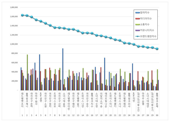 2020년 2월 걸그룹 개인 브랜드평판 30위 순위는 레드벨벳 조이, 블랙핑크 제니, 여자친구 은하, 마마무 화사, AOA 설현, 여자친구 소원, 여자친구 엄지, 트와이스 모모, 여자친구 신비, 소녀시대 윤아, 레드벨벳 아이린, 여자친구 예린, 레드벨벳 슬기, 트와이스 나연, 여자친구 유주, 블랙핑크 지수, 소녀시대 수영, 이달의소녀 츄, 에이프릴 나은, 트와이스 미나, 레드벨벳 웬디, 트와이스 사나, 레드벨벳 예리, 블랙핑크 리사, AOA 지민, (여자)아이들 수진, 마마무 문별, 소녀시대 태연, (여자)아이들 우기, 블랙핑크 로제 순으로 분석되었다.