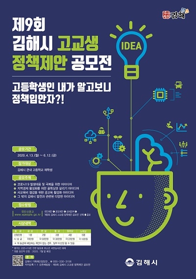 허성곤 시장은 “이번 공모전이 학생들의 생기발랄한 아이디어를 마음껏 뽐낼 수 있는 장이 되길 바라며, 고교생들의 눈높이에 맞는 창의적이고 우수한 제안을 시정에 반영하여 '김해를 더 김해답게' 만들도록 노력하겠다”고 말했다.