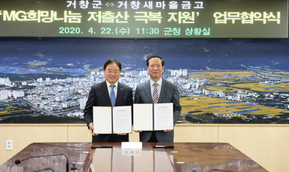 거창군은 군청 상황실에서 구인모 군수와 신경조 이사장 등 관계자들이 참석한 가운데, 거창새마을금고와 ‘2020년 출산 축하금 지원’에 관한 협약을 체결했다고 밝혔다.