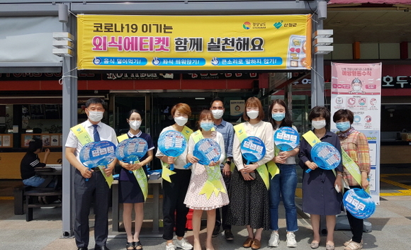 캠페인 참가자들은 이용객에는 개인접시에 반찬 덜어먹기, 다른 사람과 거리두기, 조용히 식사하기, 술잔 권하지 않기 등을 당부했다.