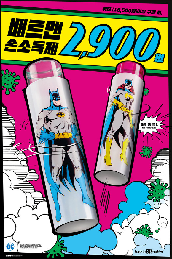 DC코믹스 캠페인의 첫 번째 공동 마케팅으로 ‘손 소독제’ 프로모션을 실시한다. 원통형 패키지 상단의 버튼을 누르면 소독 스프레이가 분사되는 형태로 간편하게 사용할 수 있다.