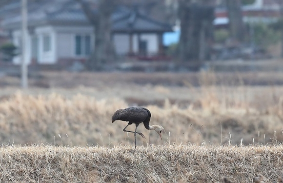 25일 지리산 자락인 경남 함양군 휴천면 엄천강변 한 들녘에서 멸종위기 2급이자 천연기념물 제228호인 어린 흑두루미 한마리가 포착돼 눈길을 끌고 있다. (사진=함양군 제공)