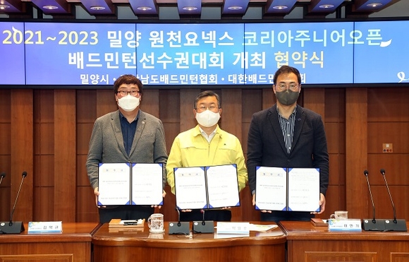 경남 밀양시는 11일 시청 소회의실에서 대한배드민턴협회, 경남도배드민턴협회와 함께 '밀양 원천요넥스 코리아주니어오픈 배드민턴선수권대회'의 개최 협약을 체결했다.