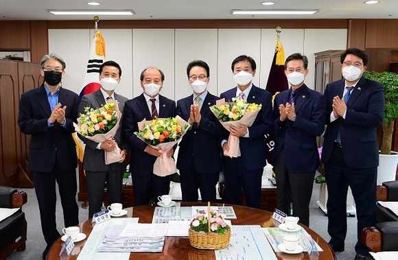경남도의회 김하용 의장은 12일 4·7 재보궐선거 당선 도의원들과 차담회을 갖고 도의원 배지를 달아주며 당선을 축하하는 자리를 가졌다. 이 자리에는 장규석 제1부의장과 심상동 의회운영위원장도 자리를 함께했다.