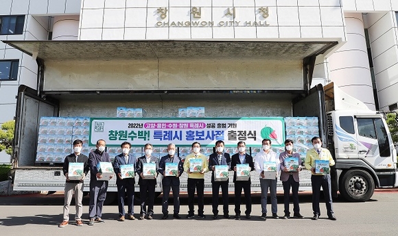 경남 창원시는 6일 오전 시청 앞 광장에서 '창원수박 특례시 홍보사절 출정식'을 갖고, 수박 1500여 통을 경기권 3개 도시로 실어보냈다.