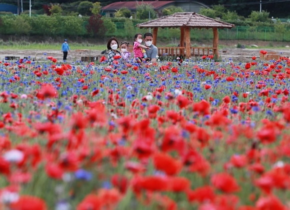 비가 그친 17일 경남 함양군 상림공원에서 한 가족이 활짝 핀 양귀비꽃을 감상하고 있다. (사진=함양군 제공)